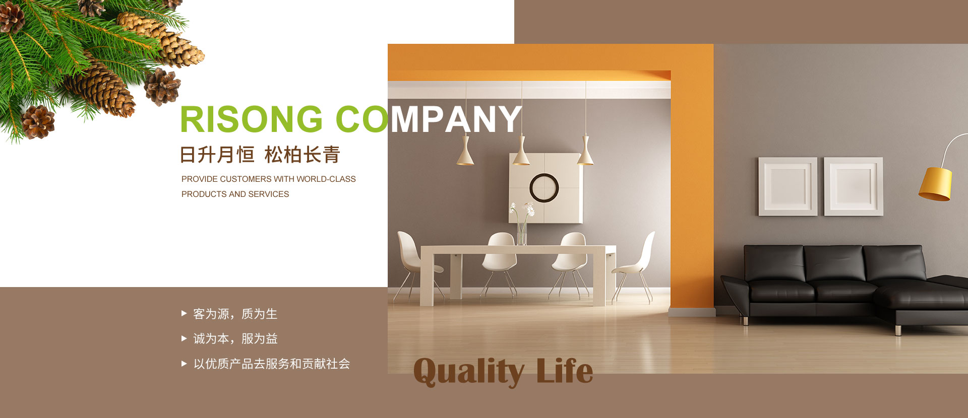 大連日松將一直秉承“以優(yōu)質(zhì)產(chǎn)品去服務(wù)和貢獻(xiàn)社會(huì)”的經(jīng)營(yíng)宗旨;“客為源,質(zhì)為生、誠(chéng)為本、服為益”的經(jīng)營(yíng)理念;達(dá)到“使用者、銷(xiāo)售者、制造者”三者并存共榮之經(jīng)營(yíng)思路;全體日松人將以“熱情、禮貌、快捷、準(zhǔn)確”的行動(dòng)指南,不懈努力的為每一位客戶,提供行業(yè)內(nèi)一流的高端、環(huán)保、舒適、健康的產(chǎn)品和細(xì)節(jié)服務(wù),打造出適合“您”的優(yōu)質(zhì)家居住宅環(huán)境。